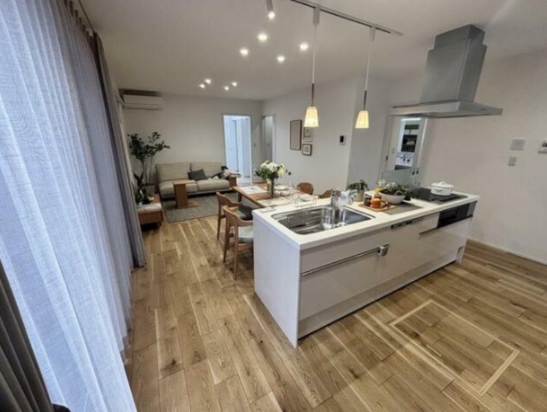 | 設備・条件 | 食器洗浄乾燥機、IHクッキングヒーター、オール電化、シャンプードレッサー、洗浄便座、浴室乾燥機、複層ガラス、モニタ付インターホン、駐車場3台分、バス1坪以上、浴室暖房、2口コンロ、アイランドキッチン、浄水器、全居室収納、クローゼット、照明器具、全居室フローリング、電気、エアコン、カードキー、火災警報器(報知機)、駐車場3台分以上 | ||